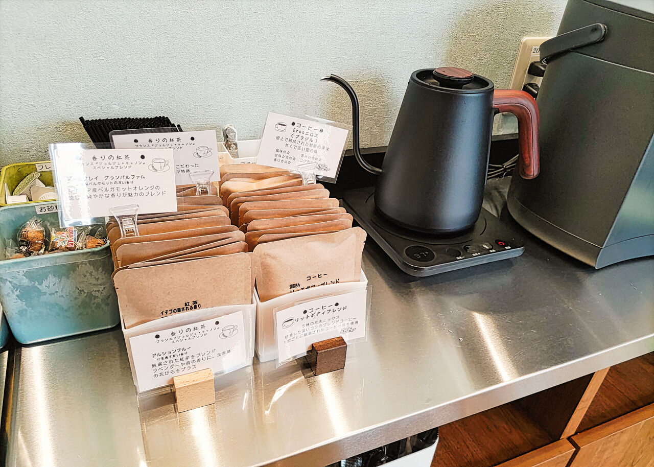 珈琲や紅茶などのお飲み物やお水はセルフサービスとなり、ドリンクバーが設けられています。珈琲の抽出に必要な用具、ジュースが入ったジュースディスペンサー、給水(湯)器があります。