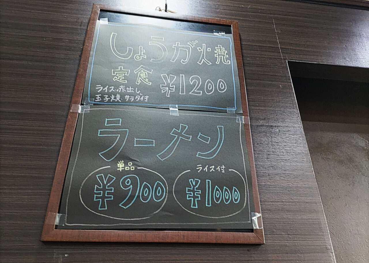 お食事メニューについては、壁に掲げられたボードにて、抜粋的にしょうが焼き定食やラーメンが紹介されています。