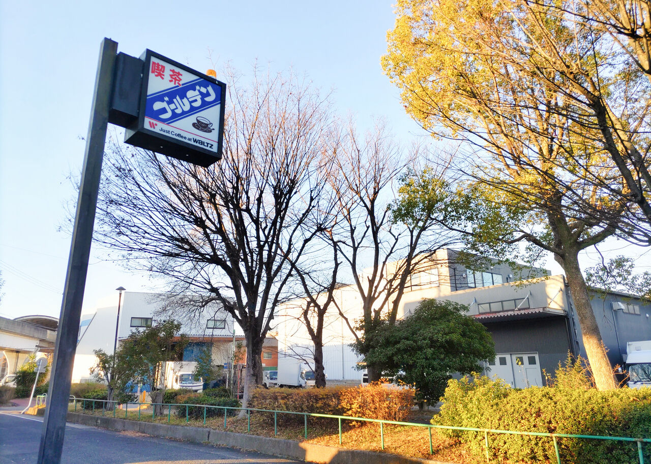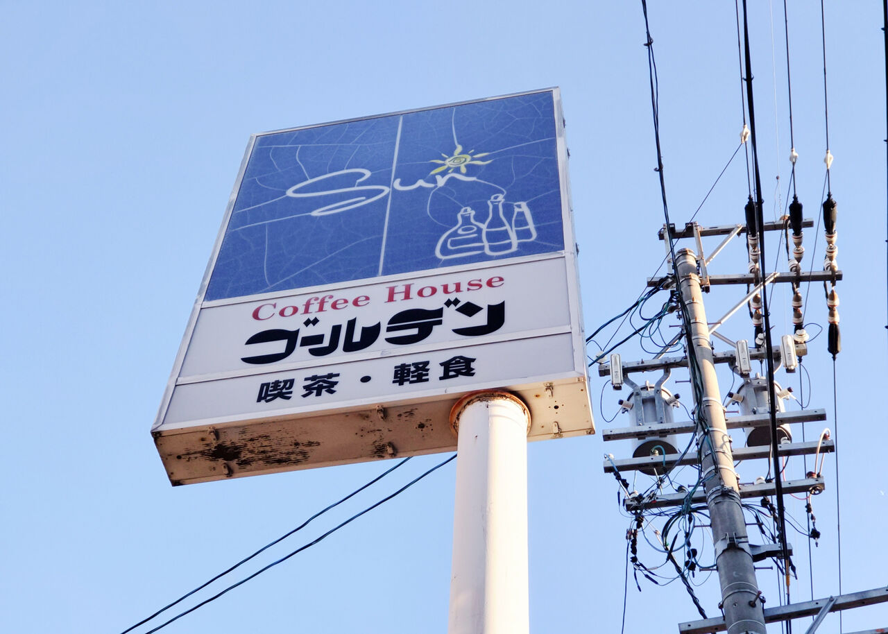 喫茶ゴールデンは、今から20年ほど前から営業を続けている喫茶店です。同じほどの高さの電柱の横に設置されたポール看板が目印です。
