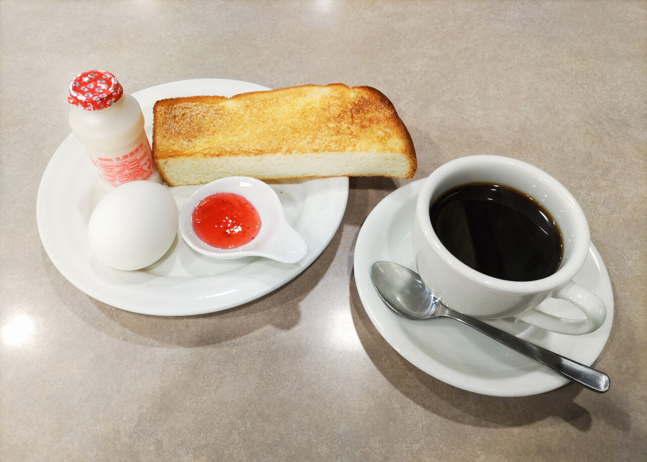 モーニングサービスは、バタートースト、ゆで卵、乳製品、ジャム付きとなります。シンプルながらも乳製品の存在感が一際あります。