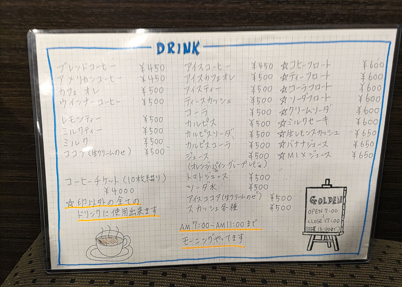 お飲み物は、コーヒー、紅茶、ココア、ミルク、ジュースなどとともに、コーヒーフロートやクリームソーダも扱っています。ちなみに、モーニングは11時までとなります。