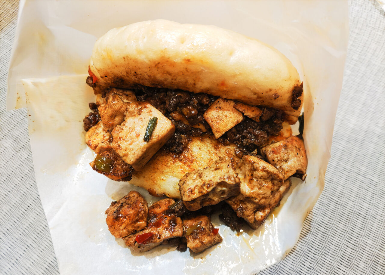 麻婆まんは、饅頭に麻婆豆腐をサンドしたものです。山椒の豊かな風味とともに辛みの効いた麻婆豆腐と、ほんのり甘い饅頭との相性も良く、お食事感覚で美味しくいただけます。