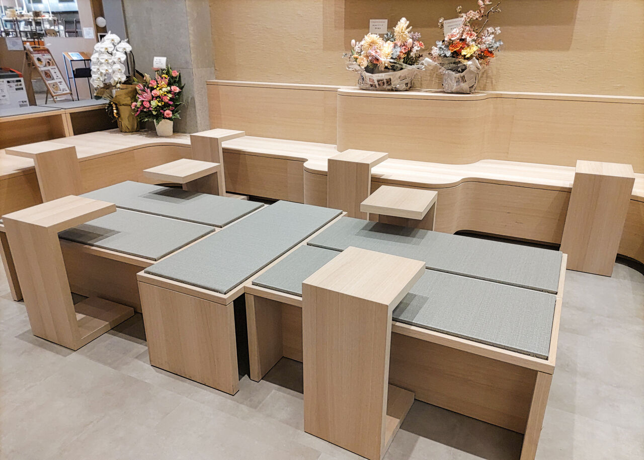 イートインスペースには、コーヒースタンドでよく見かけるような簡易型のテーブルとシートが設けられてます。ショッピングの際などに立ち寄って、軽くお食事をするにはぴったりな空間です。