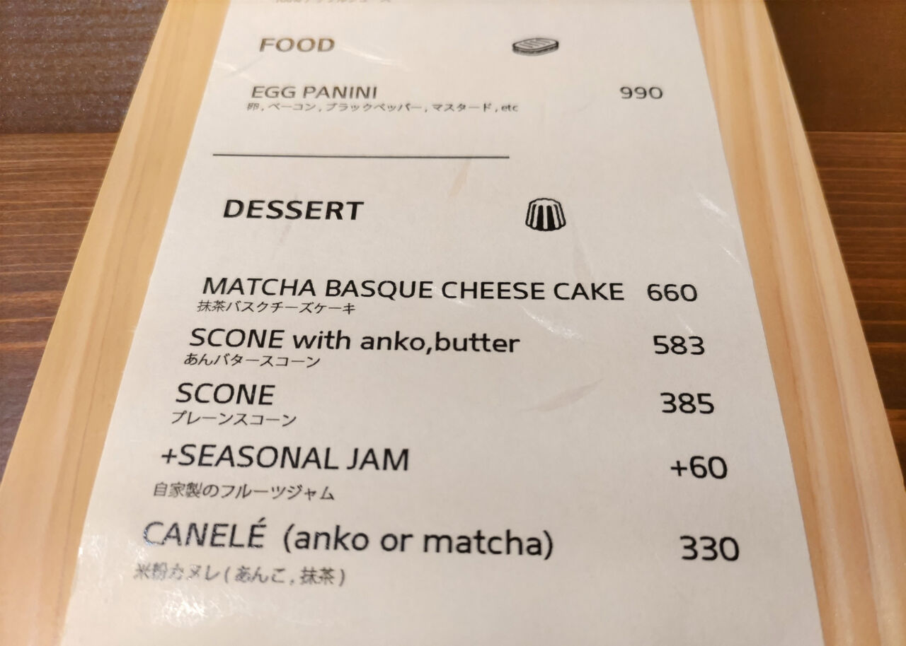 フードはベーコンとエッグなどのサンドしたパニーニ、デザートとして抹茶バスクチーズケーキ、あんバタースコーン、プレーンスコーン、米粉カヌレがあります。