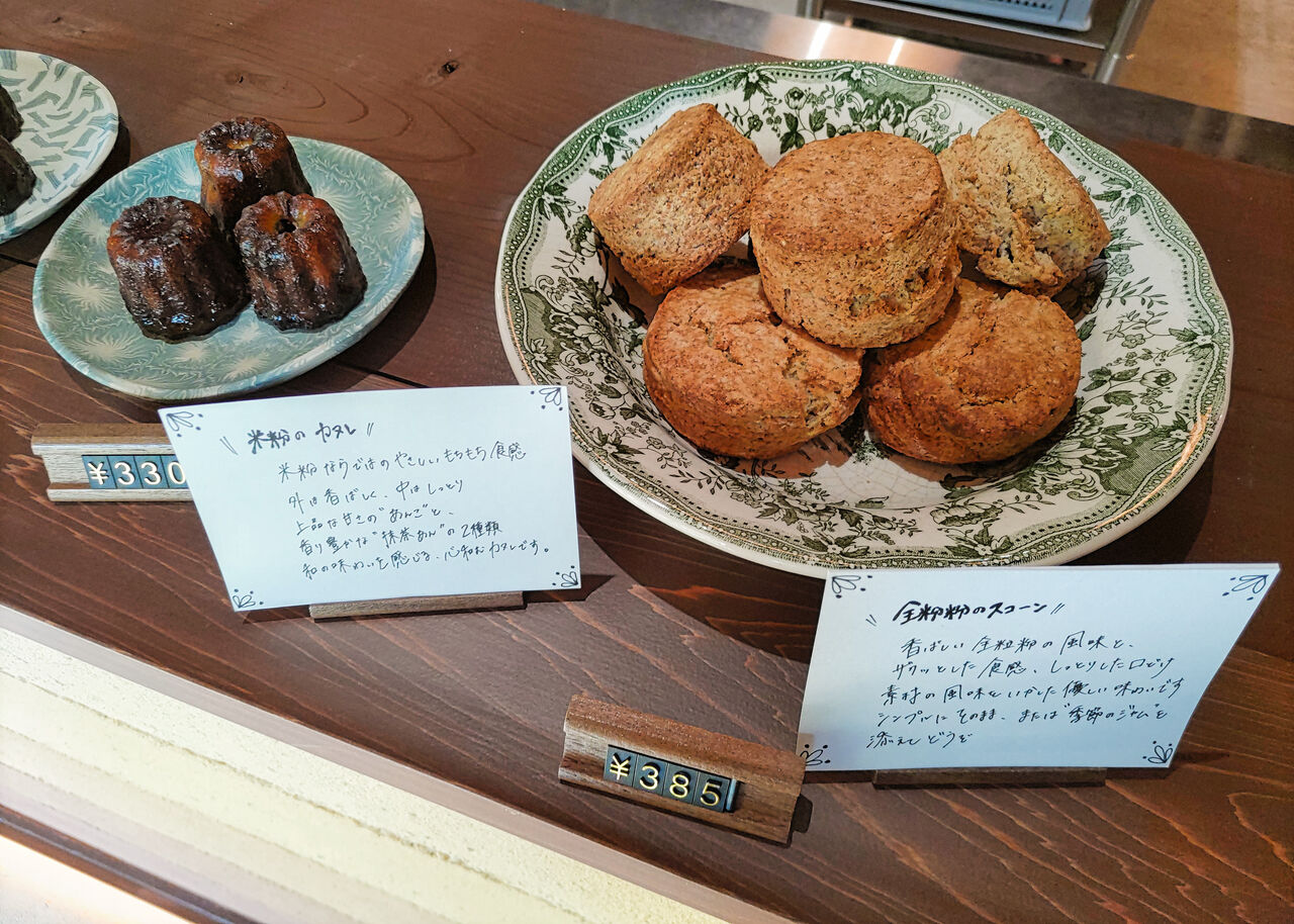 米粉カヌレとプレーンスコーン(全粒粉のスコーン)については、テイクアウトにての購入が可能で、カウンターの店頭に並べられています。