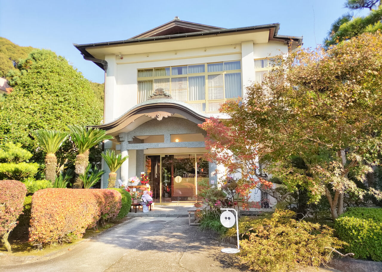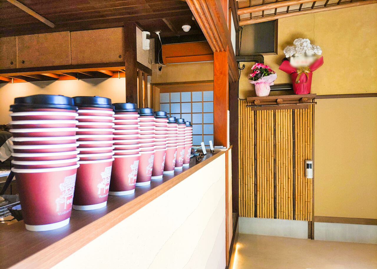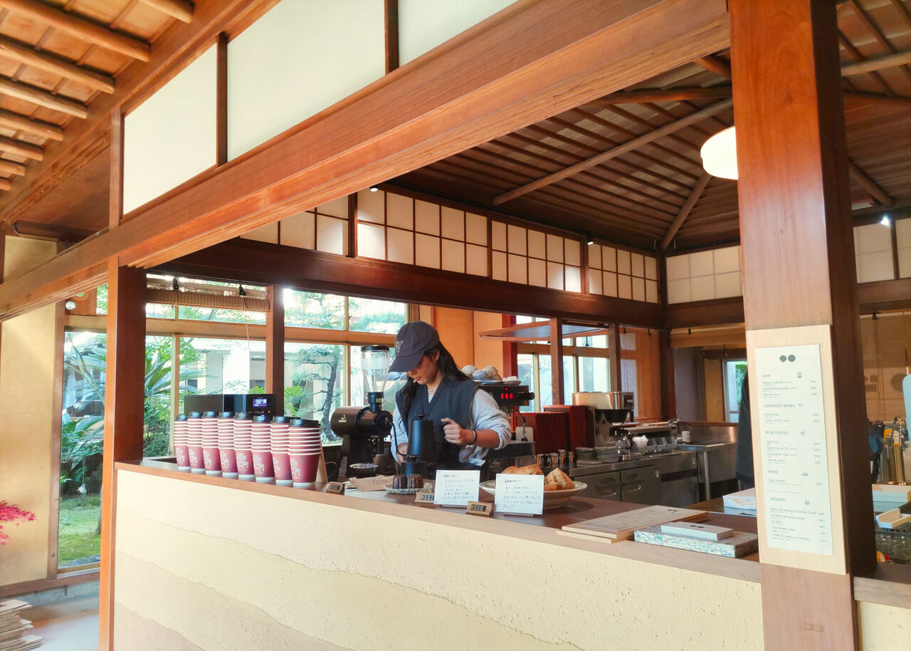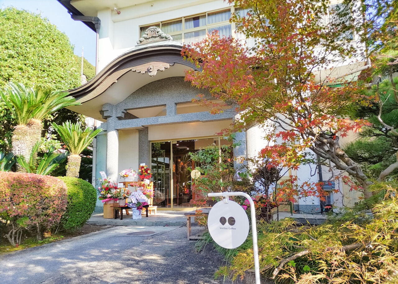 新しくオープンしたVeritas coffeeは、その山門整備事業に合わせて1976年(昭和60年)に建築された観月の間にお店を構えます。場所は山門(鐘楼門)より右手に入った奥になります。