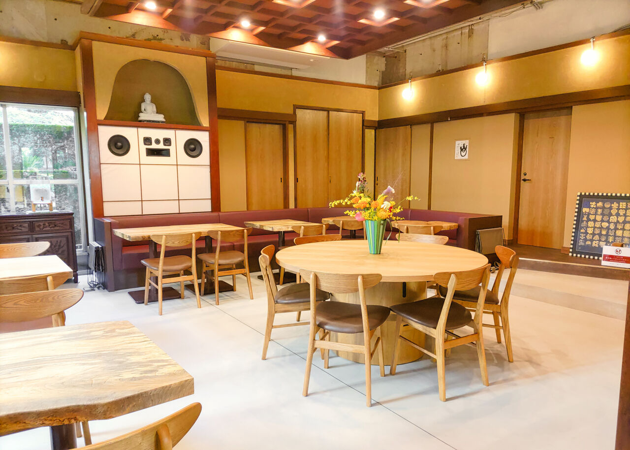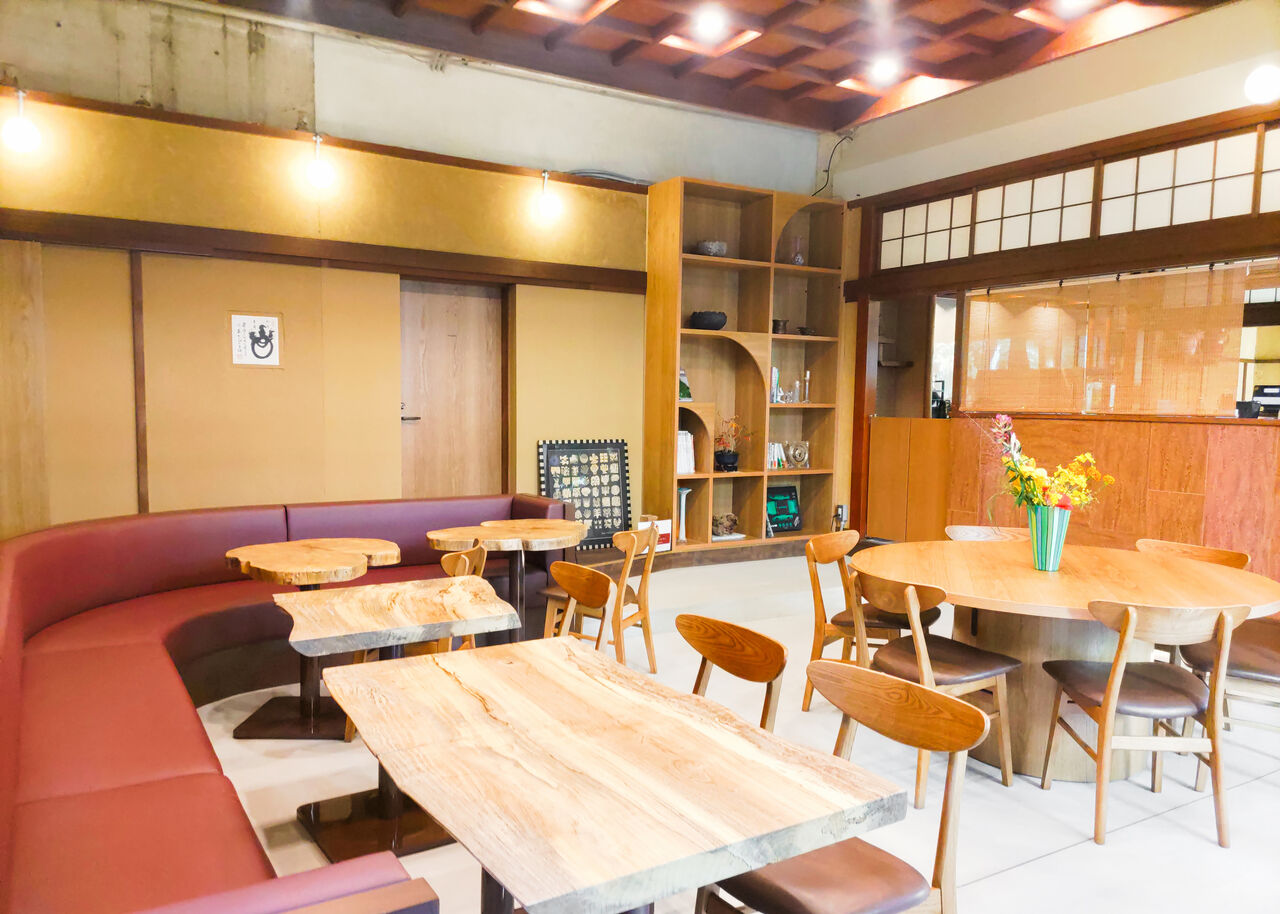 広間は、温かみのある明るいトーンでまとめられた空間です。和風テイストな佇まいを残しながら、天井の一部を剥き出しにするなど、今どきのお洒落なカフェでよく見られるようなシックで洗練された空間です。