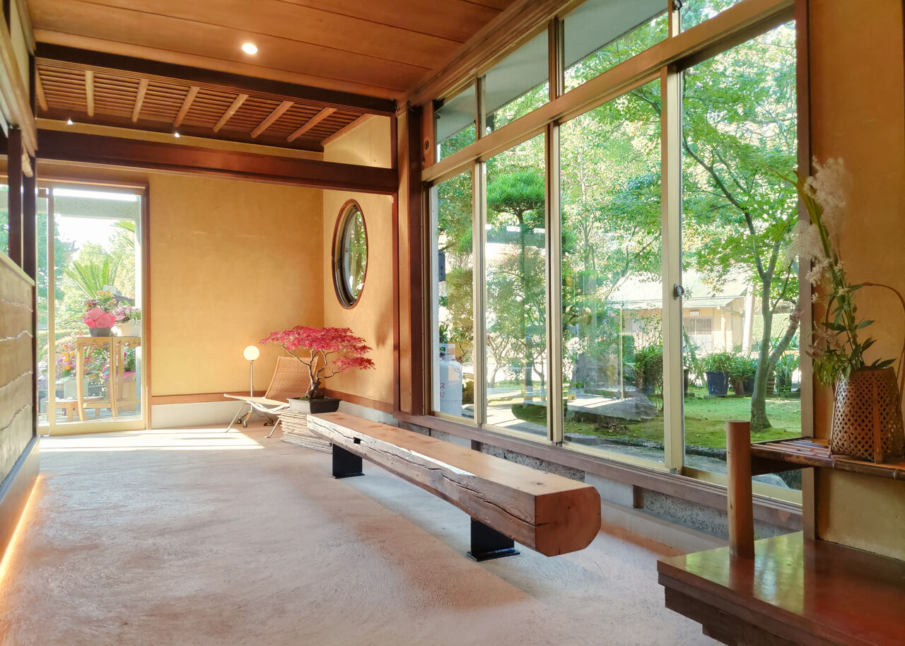 ワイドな窓からの庭園の眺めが素晴らしく、ベンチシートも設置された通路を通り抜けると、奥にはお茶が楽しめる広間があります。