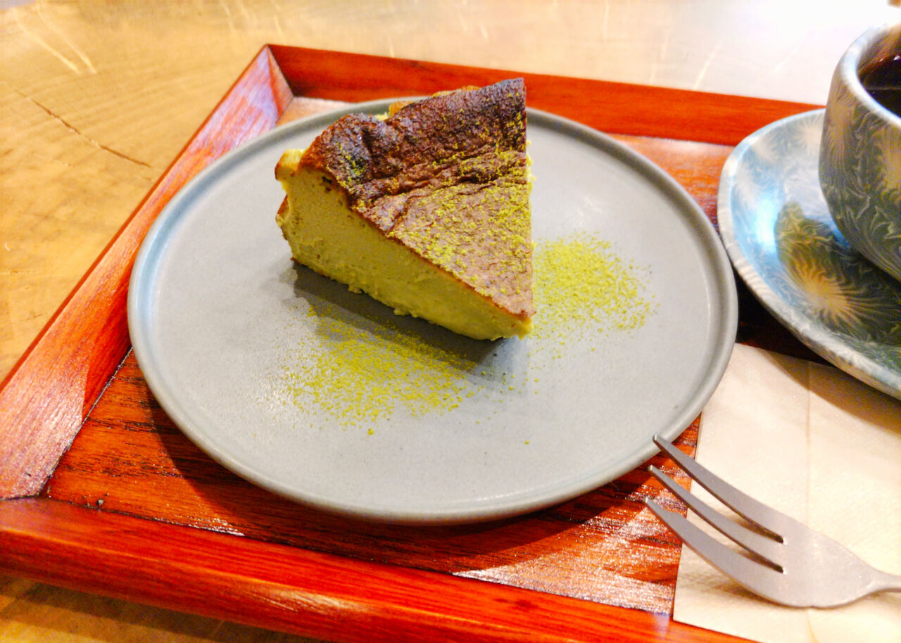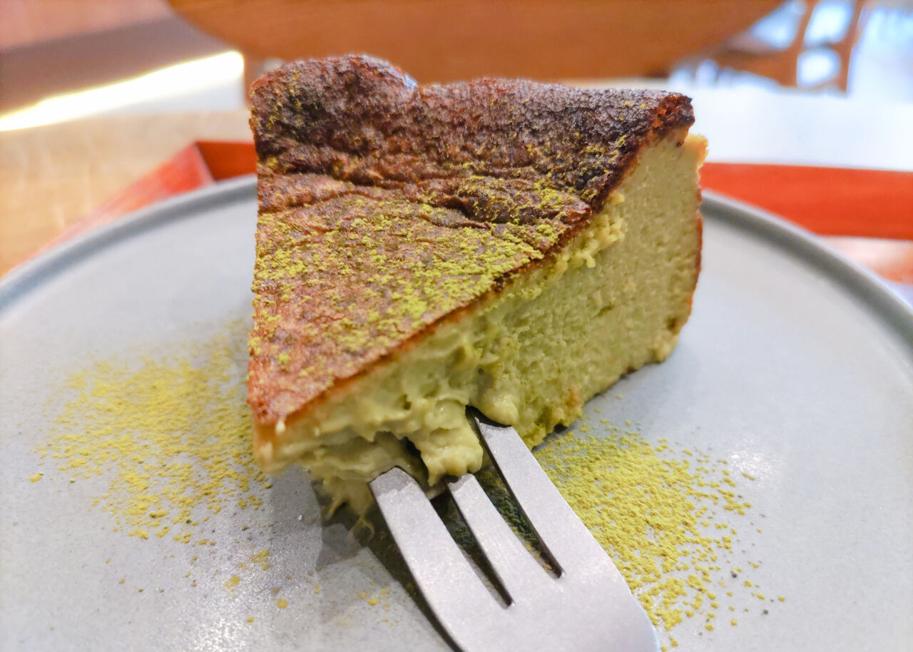 店内にて焼き上げたという抹茶バスクチーズケーキは、抹茶粉をたっぷりとまぶしてお皿に載せてあります。