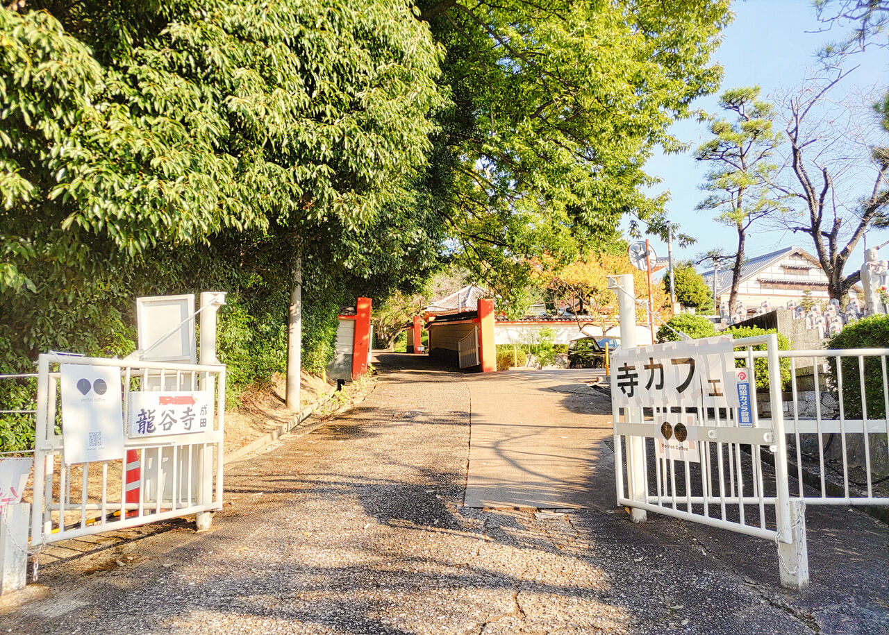 龍谷寺と敷地を共にする日東保育園に隣接する保育園来園者の駐車場の入口でもあるゲートに掲げられた「寺カフェ」と記された表示が目印となります。