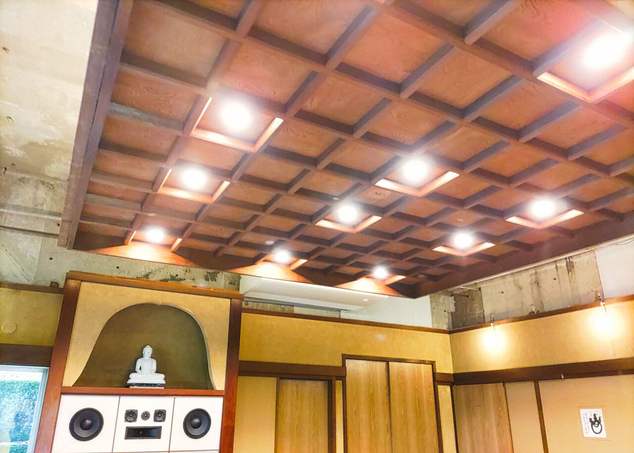 天井を見上げると木が織りなす格子状に組まれた木材でつくられた格天井(ごうてんじょう)が張り巡らされて、格式の高い和の趣と温もりを与えてくれます。