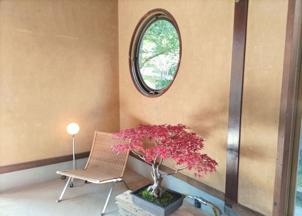 カフェがある観月の間の1階正面より、左手側となる通路の入り口の角にある、土壁の壁面には丸窓が設けられています。窓の先に広がる庭園の樹木の色づきが映し出されて、四季の変化を感じ取れます。