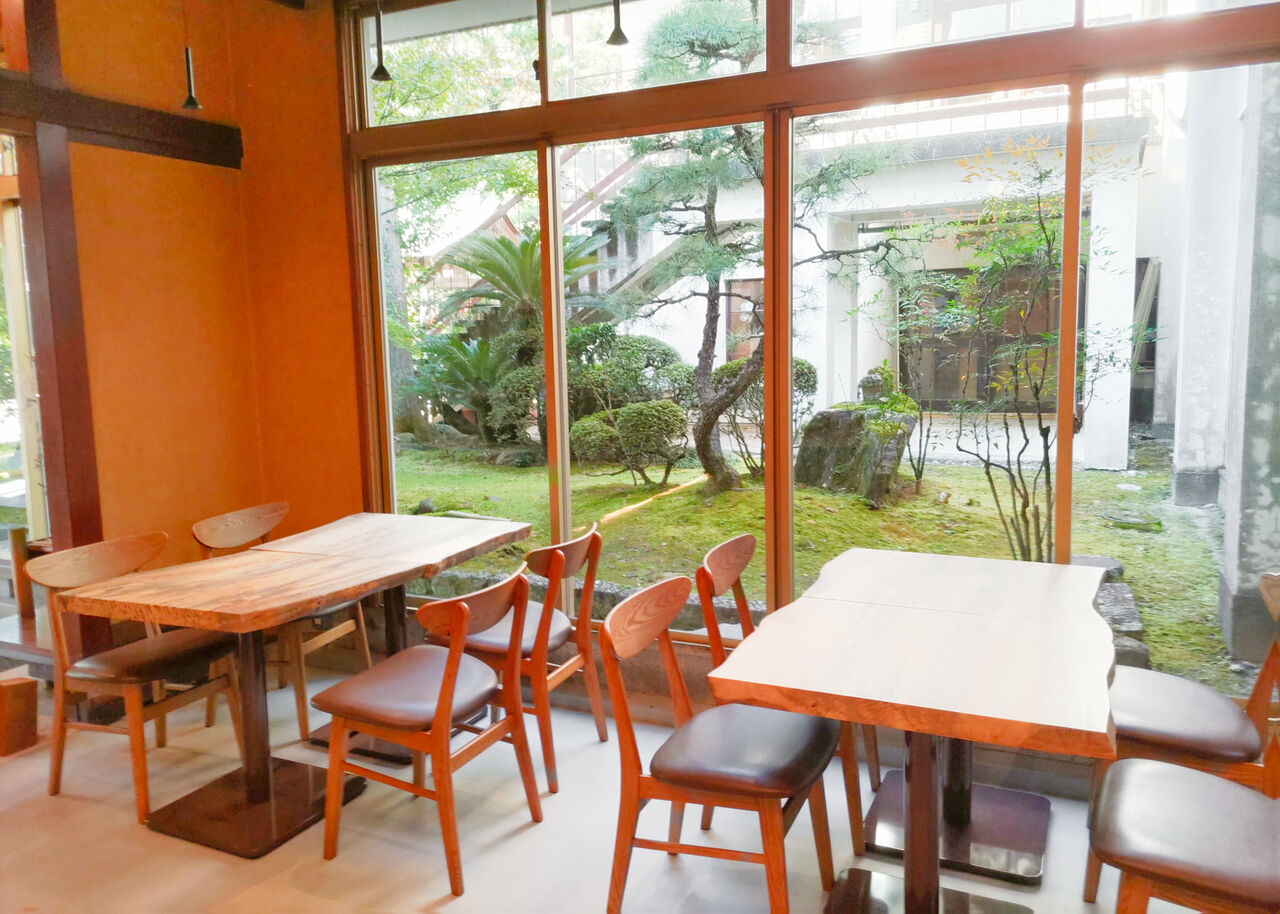カフェスペースとなる広間のうち、通路寄りの窓際にはテーブル席があり、近い距離で庭園を眺めながら過ごすことができます。