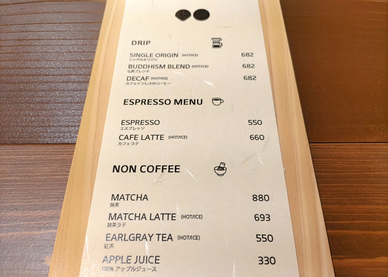 珈琲は、シングルオリジン、仏教ブレンド、カフェインレスの珈琲の3種類を扱い、すべてハンドドリップにて抽出したものが提供されます。ほかのお飲み物として、エスプレッソ、抹茶、紅茶、ラテ、りんごジュースを扱っています。