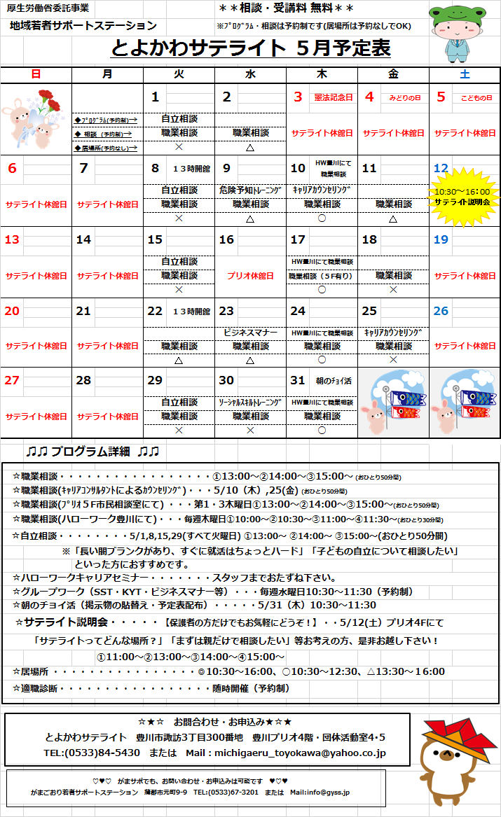 との自立・就労相談がとよかわサテライトでできるようになります。詳しくはサテライト5月の予定表をご覧ください。
