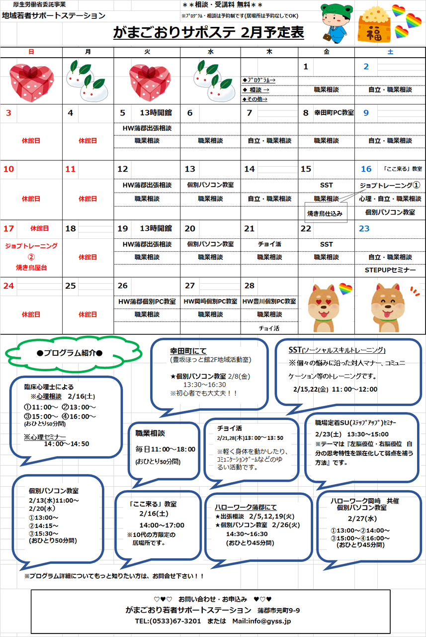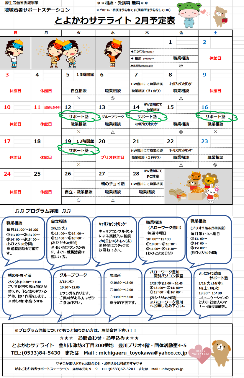 2月のスケジュールができましたので、ご確認ください