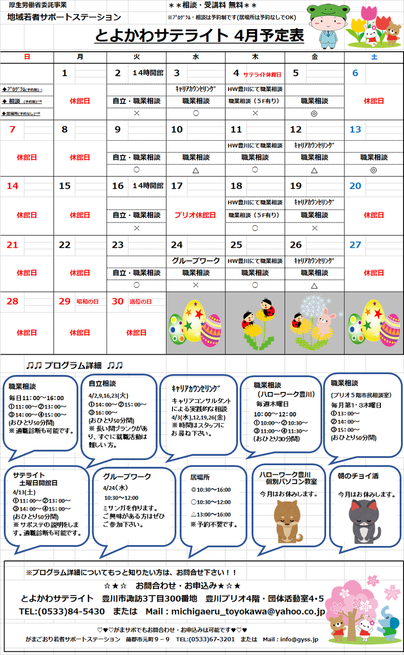 さて、4月のがまごおりサポステ、とよかわサテライトのスケジュールができましたので、ご確認ください