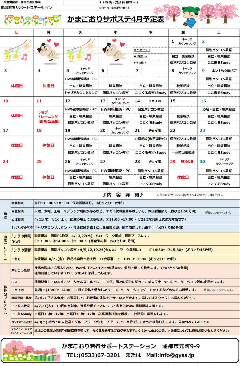 さて、令和4年4月のがまごおりサポステ、とよかわサテライトのスケジュールができましたのでご確認ください