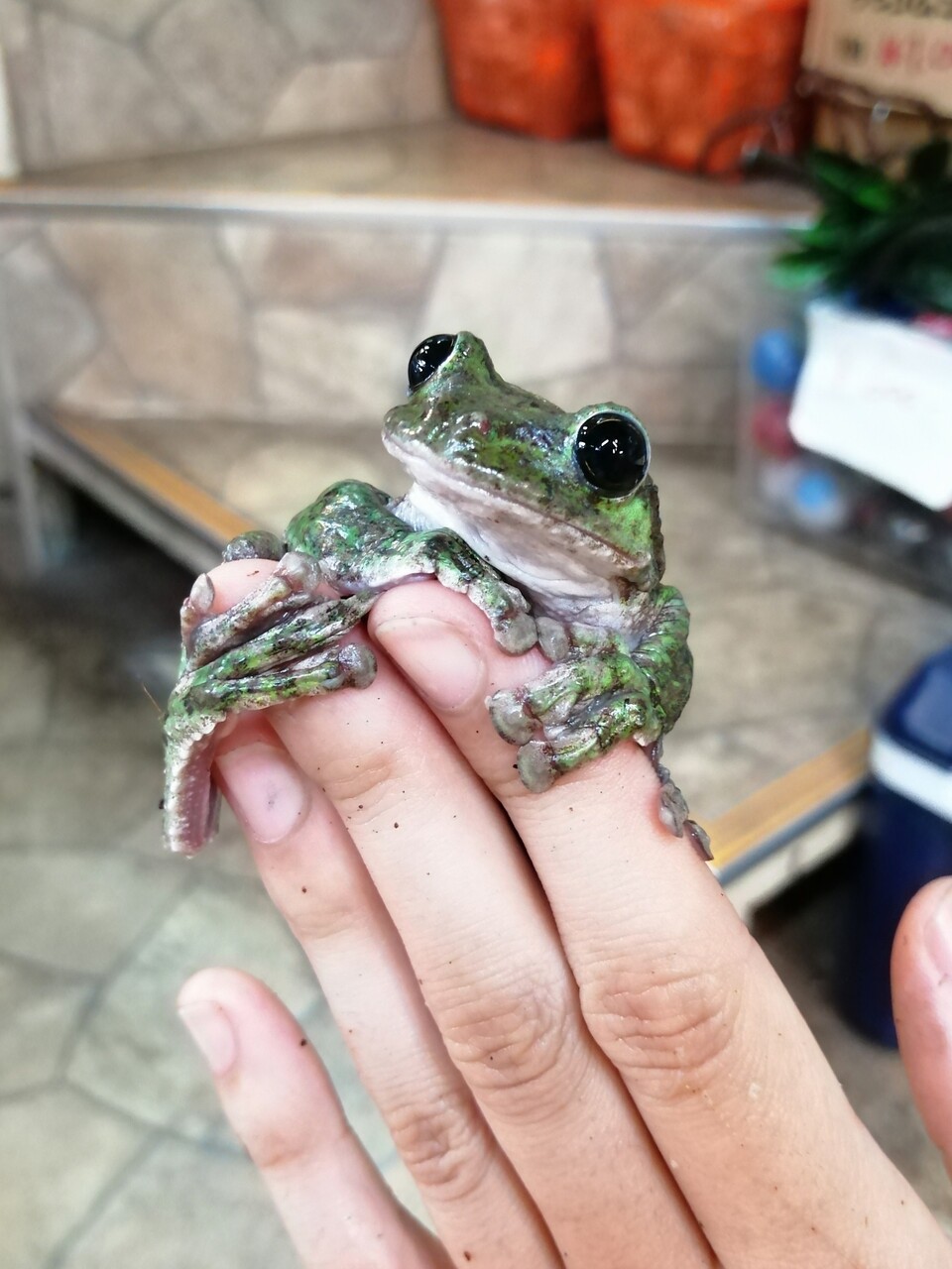 営業中は土の中に潜って出てこないので姿がなかなか見れないですが、全身鮮やかな緑色で口元に少し赤みもあり非常に綺麗!
