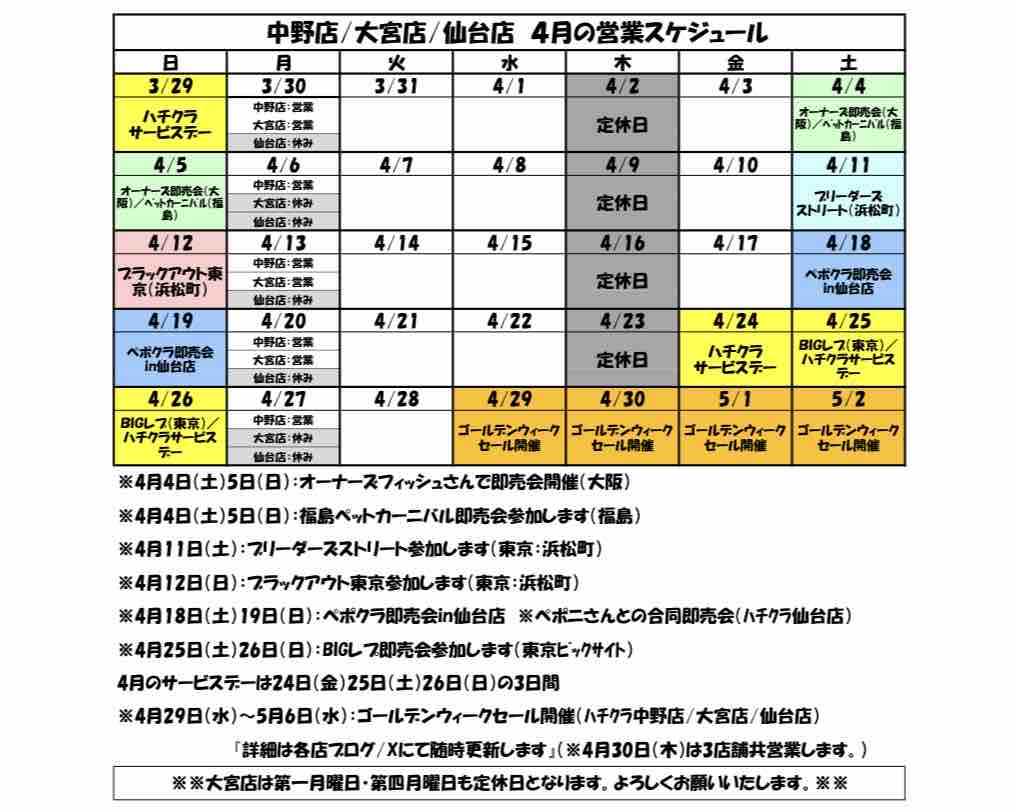 2026年04月03日 ハチクラ大宮店4月スケジュール こんにちは!あっという間に4月になってしまったので取り急ぎ営業スケジュールだけお知らせ致します!生体スタンプカード配布中!スタッフ募集のお知らせ!ハチクラ大宮店の4月営業スケジュール!イベント出展などもありますのでご来店の際は是非チェック!↓↓ざっくりスケジュール!↓↓大宮店は第一・第四月曜日を現在定休日とさせていただいております。何卒ご了承ください。随時、情報は出していきますのでブログだけでなくXの投稿など更新をお待ちください🙌 カテゴリなしの他の記事
