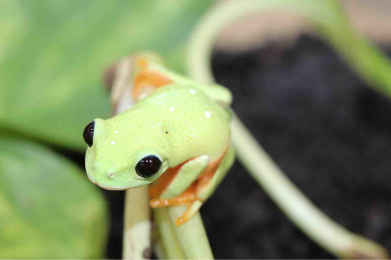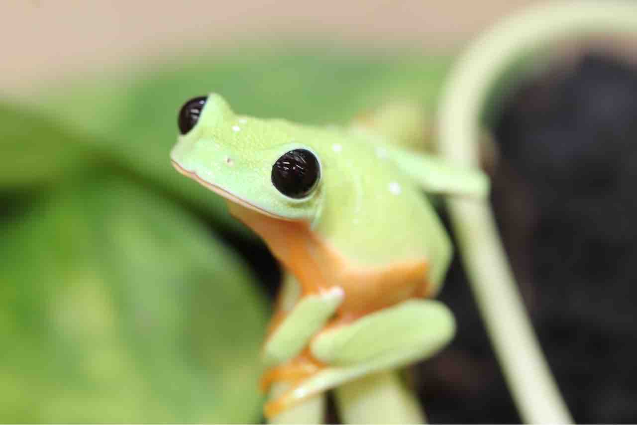 キュルキュルの黒目とオレンジの腹部がとてもキュートなカエルです