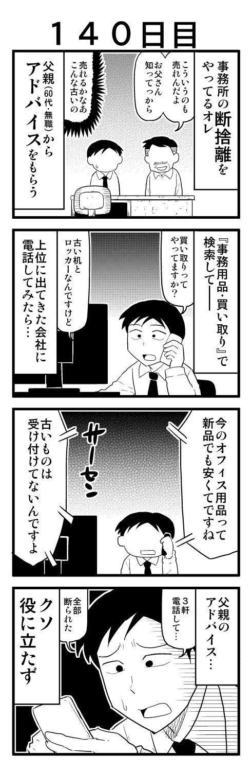 2018年06月18日 赤字の会社が廃業してからの生活『140日目』 オフィス用品はよっぽど新しいかきれいじゃないと買い取りできないみたいです。しかも仕事で使ってた机とかロッカーは事業ごみになるので、専門の業者に回収を頼まなきゃいけなくて、それでまた費用がかさむっていう。