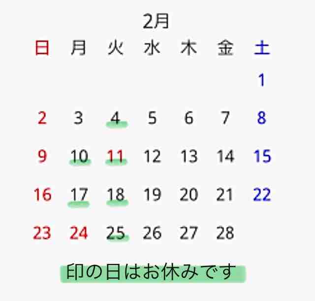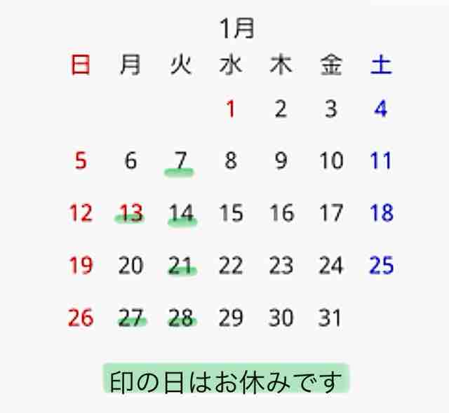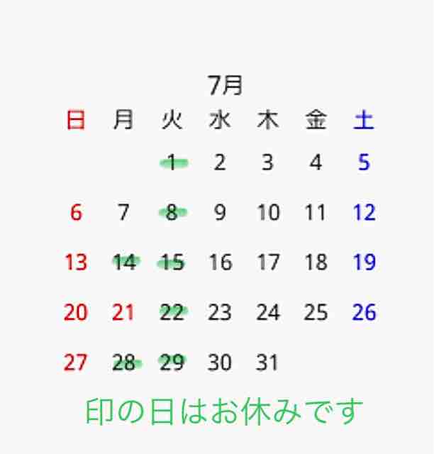 7(日)、13(土)、21(日)、28(日) 休み