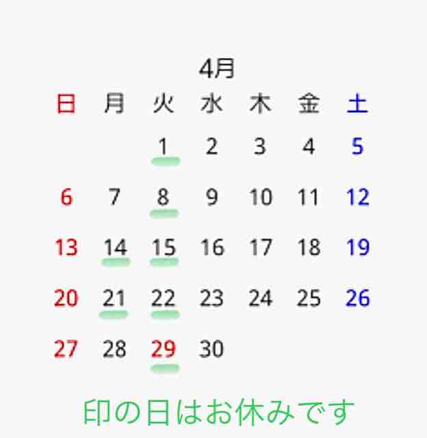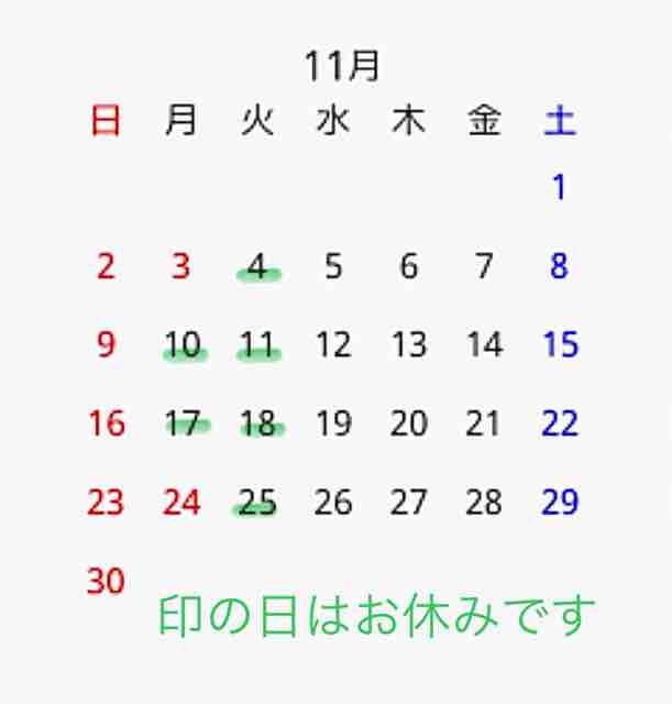 4(土)、12(日)、18(土)、25(土) 休み