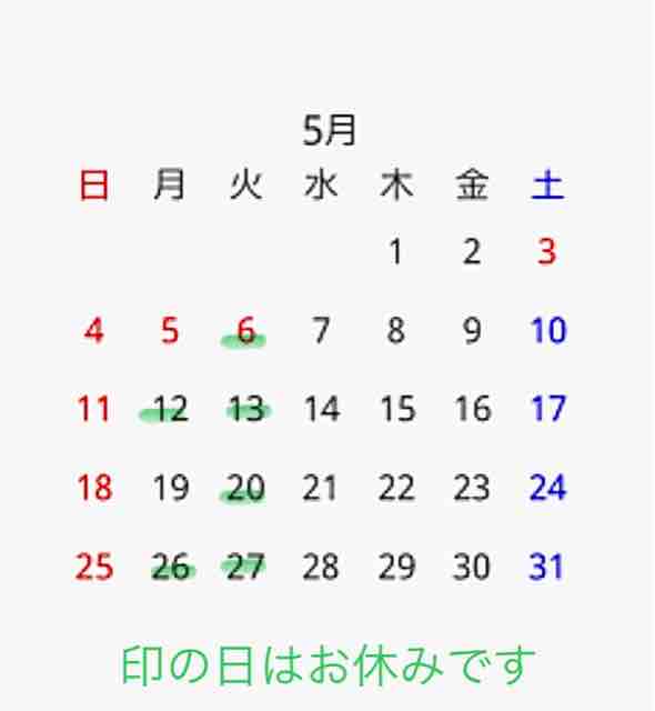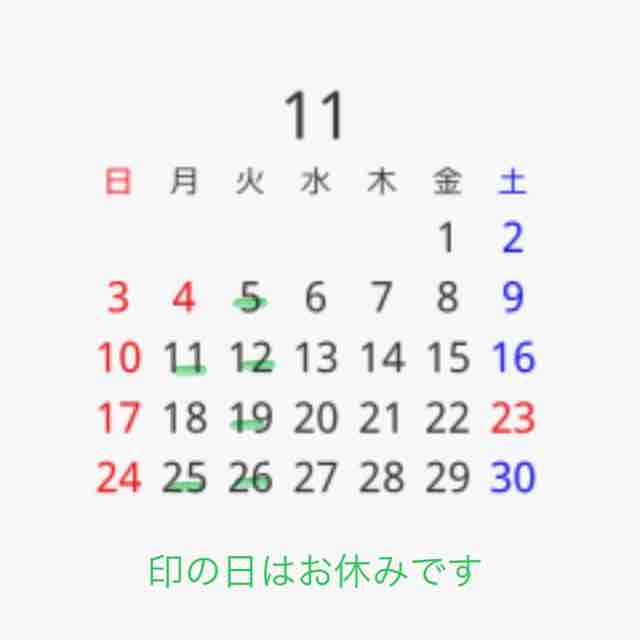 5(土)、13(日)、19(土)、26(土) 休み
