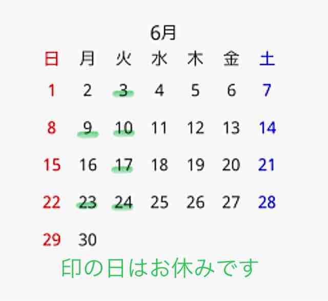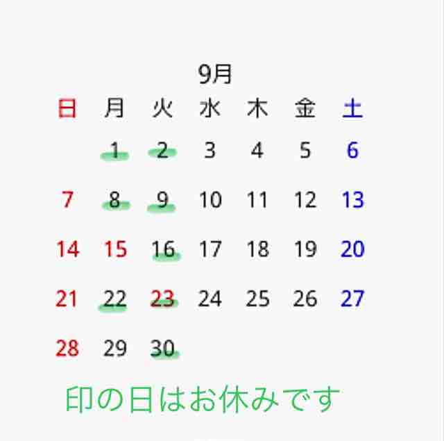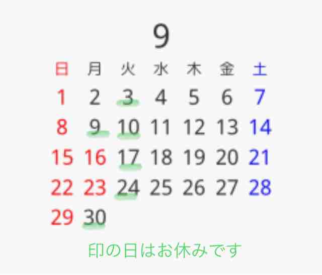 2(土)、9(土)、16(土)、24(日)、31(日)休み
