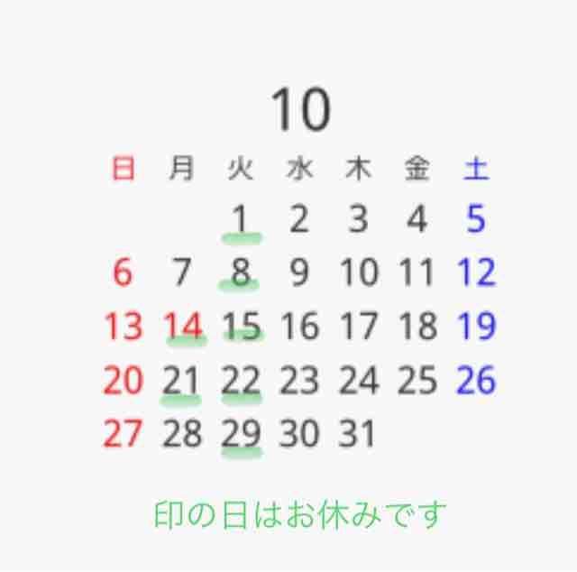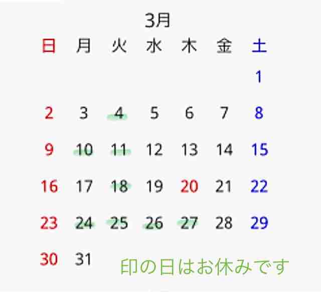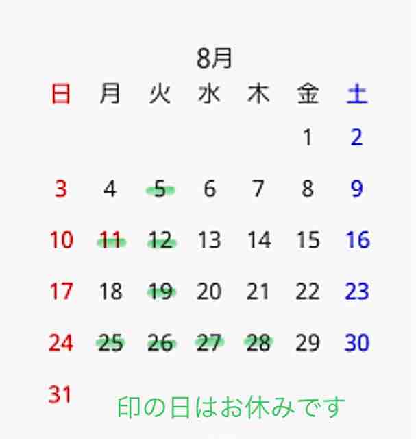 3(土)、11(日)、17(土)、24(土)、31(土) 休み