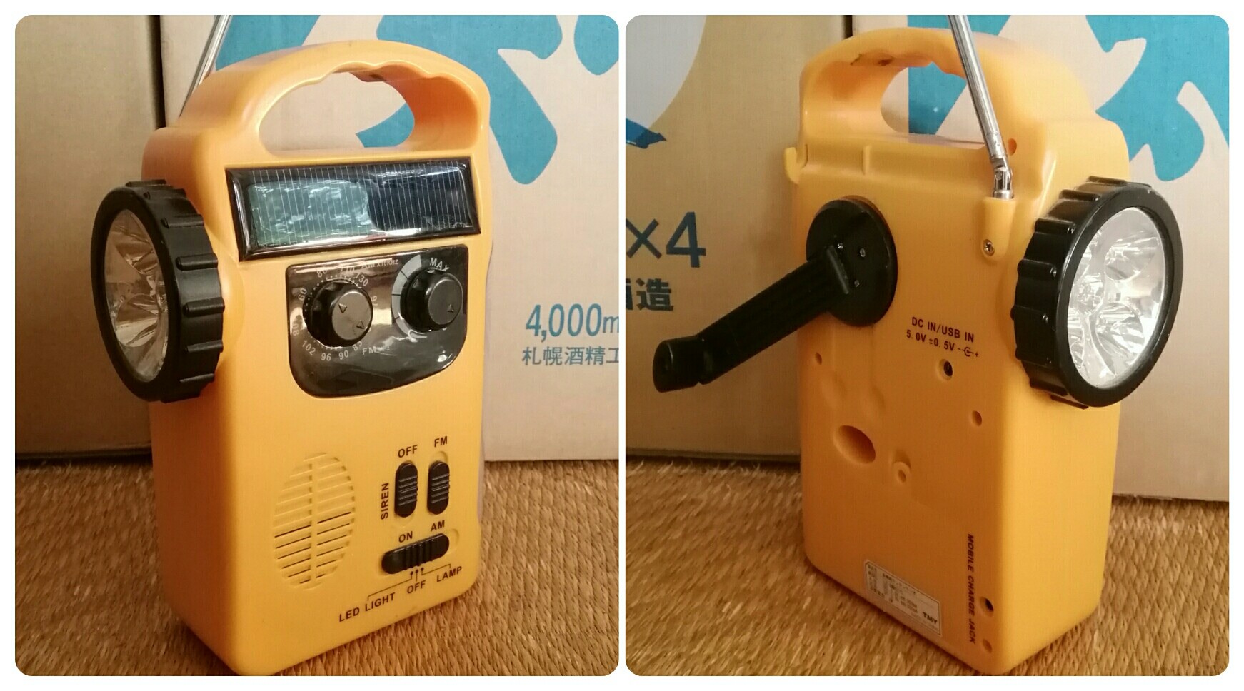 充電ピンジャックは奇跡的に捜索開始1時間後に発見されましたが、大変残念なことに、どれだけハンドルを回しても1パーセントも充電されないのですよ。結論、手回し充電は役立たずでありました。それでもソーラー蓄電されていたおかげで、ラジオはずーっと聞けるし、ランタン、サーチライト、警報ブザーも充分使用可能。災害対策ラジオとしては充分だったかな。