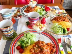子どもが喜んだ♪盛り付けのワンプレート 2020-3-8 17:23:49 記事を読む ある日のおうちランチ~ オムライス トマト煮込みのっけ サラダ ヨーグルト 前日の晩ごはんのトマト煮込み 鶏モモ肉・新玉ねぎ・しめじ・えのき・セロリが入っています。 たまごの下のごはんは、人参・ピーマン・新玉ねぎ・ウィンナー入りのバター醤
