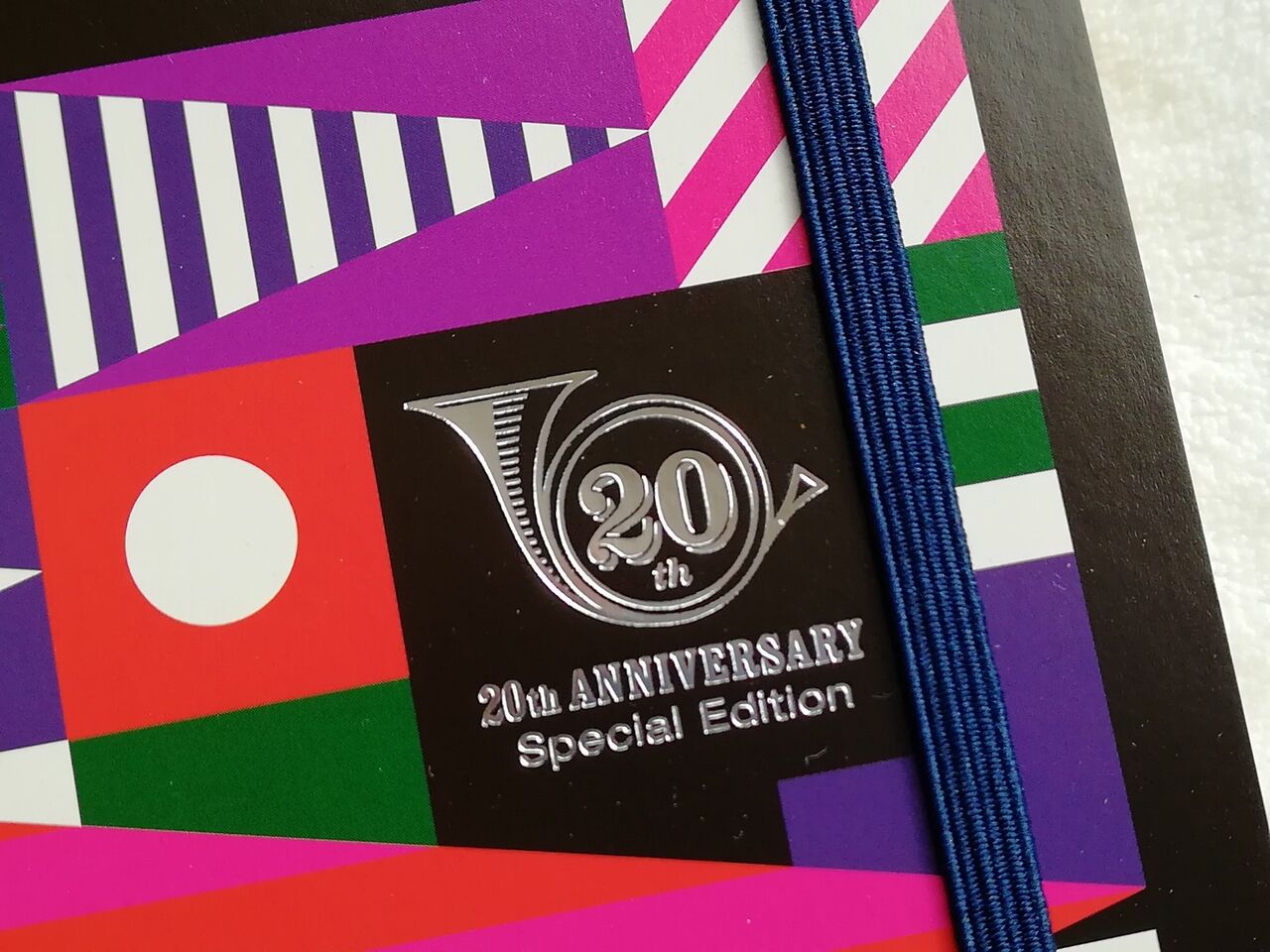 20周年ロゴがホルンと思われる金管楽器を用いてデザインされ、シルバーの箔押しで配されています。これもカッコいいですね。
