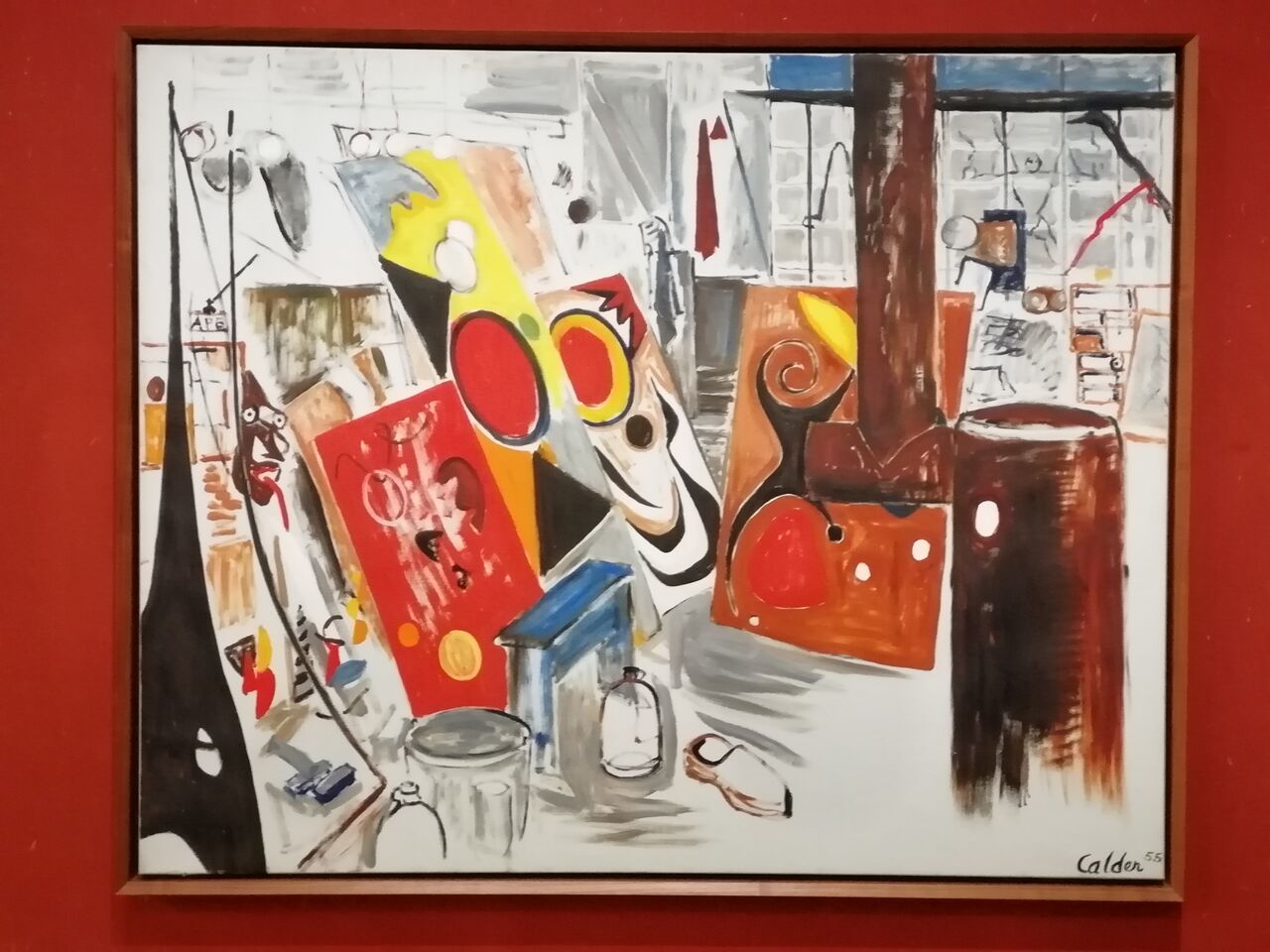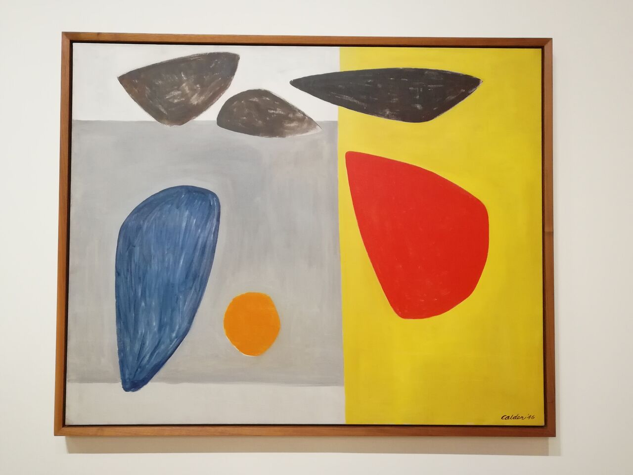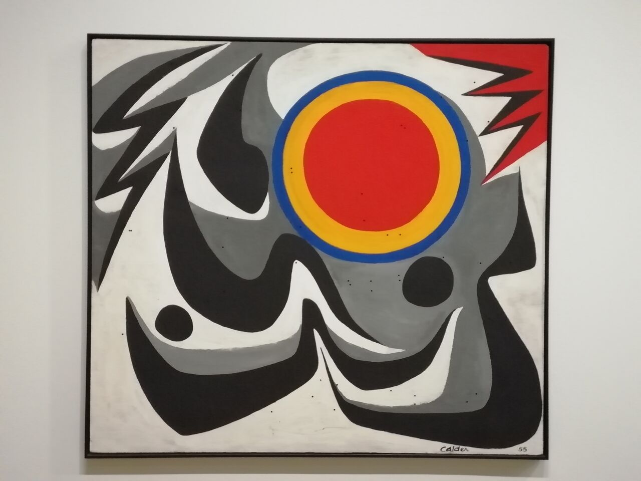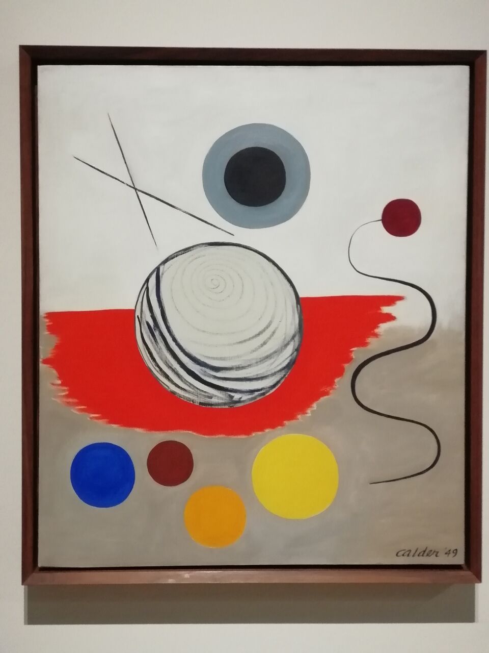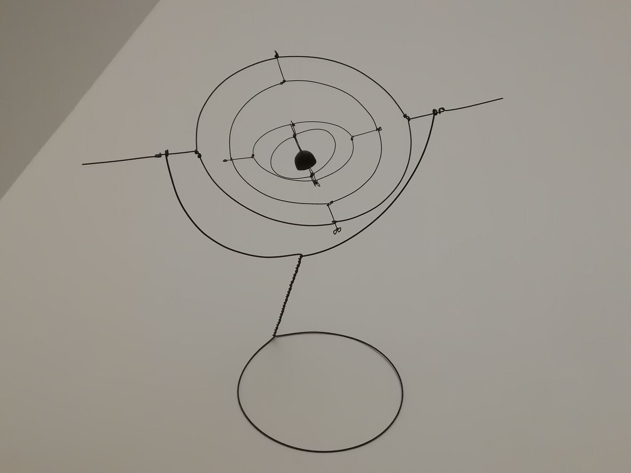 絵画でもモビールや彫刻作品においても、カルダ―の作品では丸い形と線がモチーフとされているように感じられます。細い針金を穴に通して絶妙なバランスを図るような作品制作を続けるなかで、線や円の形状やマテリアルの質感に対する思い入れやこだわりへの意識的な表現であるように感じられます。天井から吊るされてぴんと張った一本の線を基軸に、どの位置につなぎ目を作ればバランスが取れるか、その一点を探ろうとする試行錯誤の繰り返しのなかで生まれたものかもしれません。