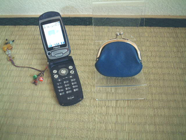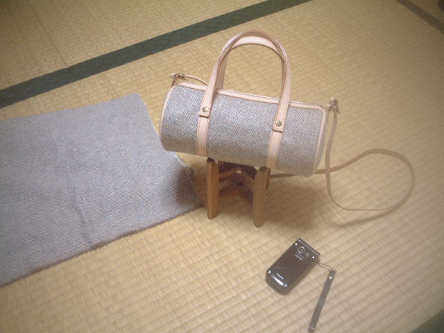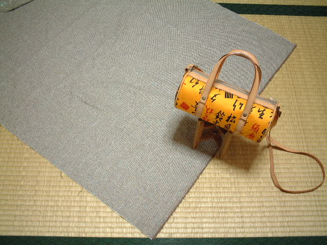 畳の上に広げている布(服地?)がお客様が持ってきてくれはった生地です。小さいバッグが筒バックです。写真=源氏香柄の黄色いバッグと同じものをお持込み戴いた布で作ります。