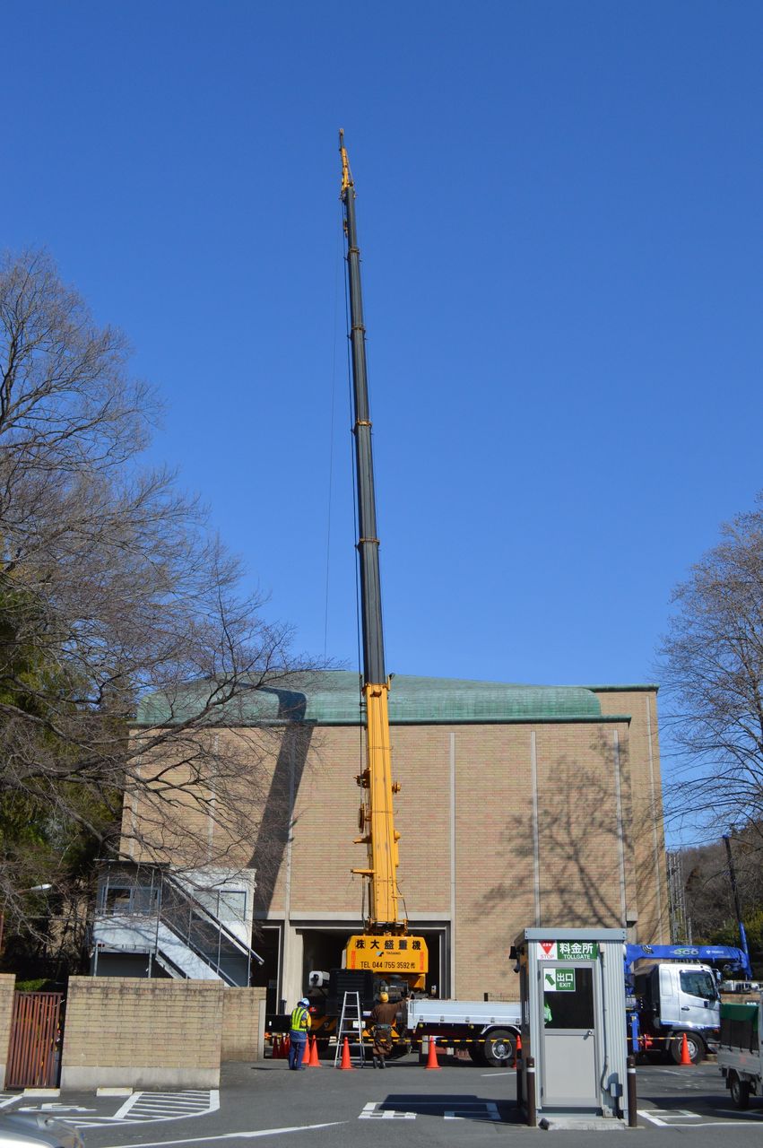 美術館の搬入口に、60トンのクレーン車が固定されました。