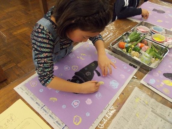 いろんな野菜の断面に絵の具をつけてスタンプしていきます。