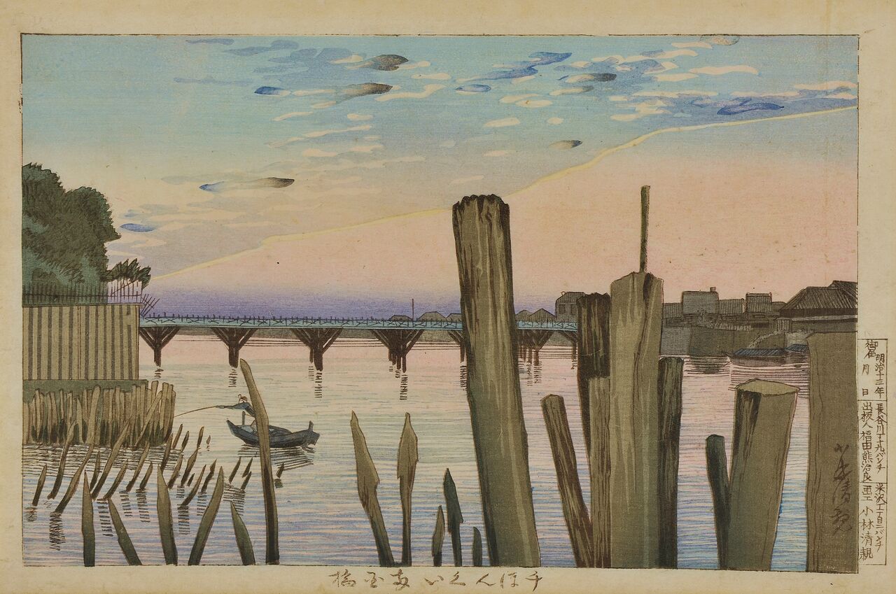 明治の小林清親の一連の「東京名所図」の空の表現は広重以上に複雑で微妙です。彼の作品には夕暮れや夜の風景が少なくありませんが、複雑な色の摺り重ねにより、それぞれの時間にふさわしい空の様子がきわめてリアルに表現されています。ときに自然現象に忠実に空を表現しようとするあまり、夕空を引き裂いて走る黄色い筋(「千ほんくい両国橋」。この現象が何を描いたものなのか、ずっと疑問に思っていたのですが、今回の展示でロール状高積雲の可能性があることを知りました)や、雲の裂け目からまるで消える直前の線香花火のように放電される稲妻(「御厩橋之図)など、風景画としてはいささか目障りなような天候現象が描かれたりします。おそらく清親はいつも空を見上げ、つぶさに観察していた絵師だったのだと思います。