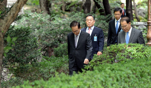 ←李明博大統領が13日、国会議長団招請昼食会に参加するために大統領府常春齋に向かっている。 大統領府カメラマン団
