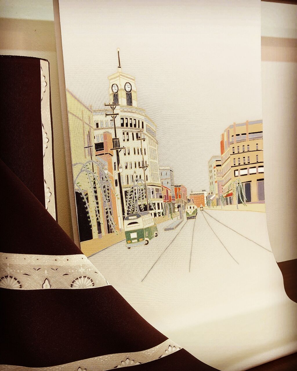 さりげなくキリッとした横段柄の小紋に「昔の銀座」を描いた塩瀬九寸名古屋帯。