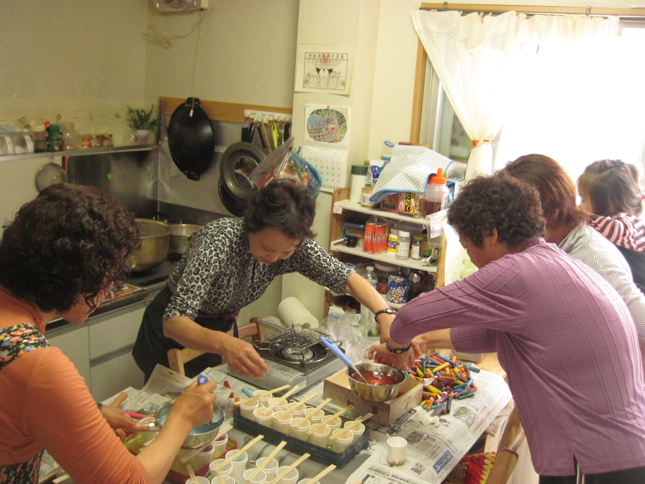 4名の女性たちは「婆々が台所で作るから」ということで、その名称を「バァーバ・キッチン」と決め、集まったロウソクを溶かしてクレヨンで色付けし、アロマエッセンスを混ぜ込んで、キャンドル製作を始めたのです。