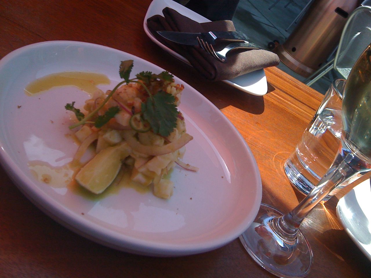 グリルした海老のサラダ、パスタ・ボロネーズ(写真なし)、ベリーのタルト。