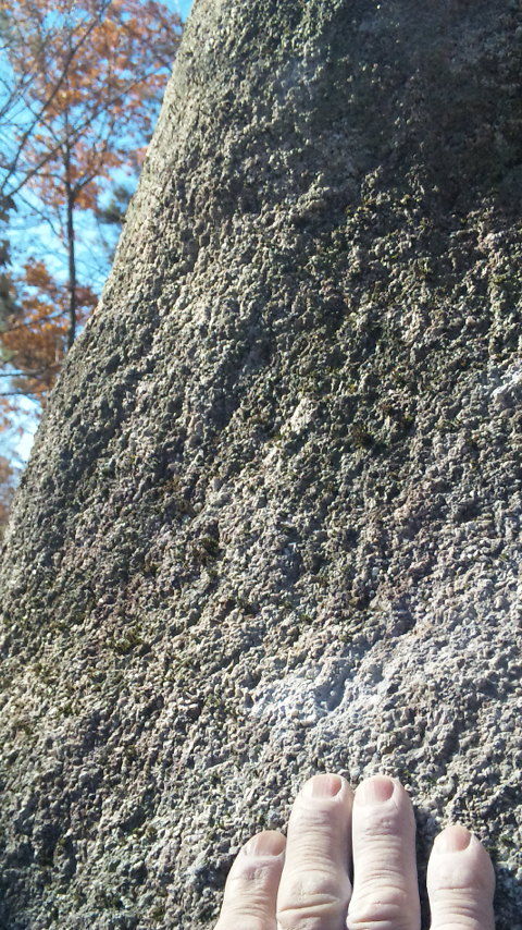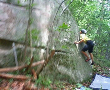 場所は羅漢寺からクライミングエリアのトレイルを100m,竹林を過ぎたら斜面の上にボルダーの頭が見える。