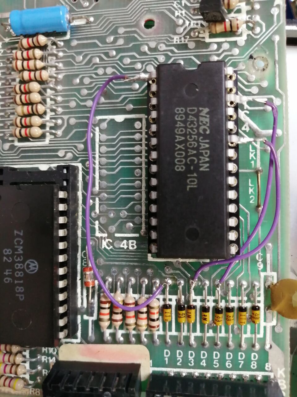 16KBにするために必要なアドレス線はダイオードD1~D8のカソード側に出ているのでここから結線する。32K SRAM 62256のピン1,23,26を起こしてそれぞれをダイオードD1(A11),D3(A12),D5(A13)のカソードと接続。TIMEX Sinclair 1000の場合はA10が配線済みなのでこのままでよいが、1K RAMのZX81ではジャンパLK1からLK2への切り替えが必要。