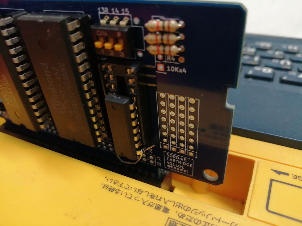 カートリッジに入れてみた。穴位置がずれてしまった。これは基板の横幅を10cm以内にするために少し縮めたときに穴の間隔も詰めてしまったせい。また、部品実装時にICソケットを使用するとカートリッジのフタを閉めることができなくなる。