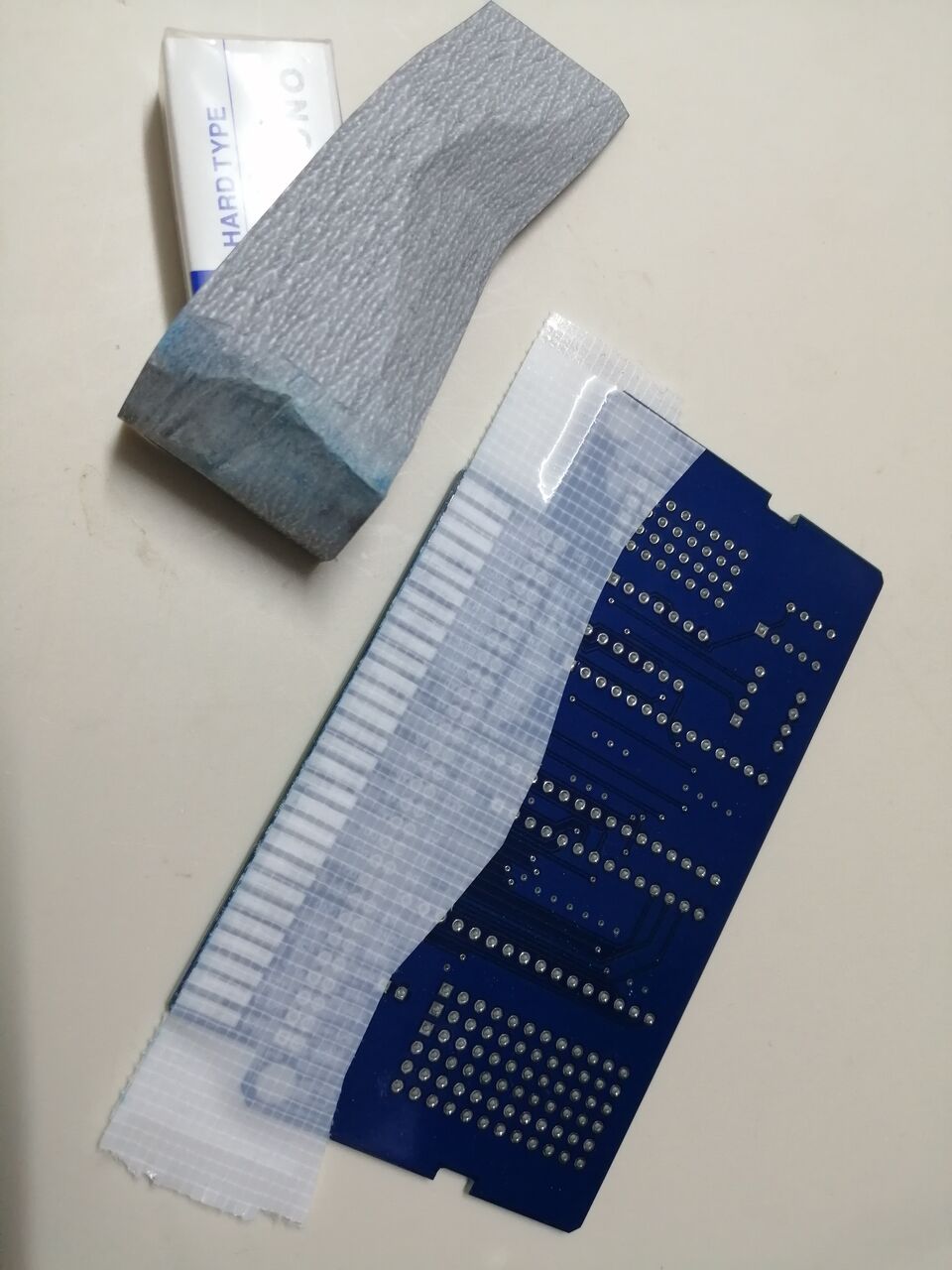 基板は1.6mm厚。特に端子の金メッキなどは指定していない。カードエッジコネクタに挿入する部分は角を丸めている。このようにテープでカードエッジの端子を保護した後で、消しゴムに紙やすりを巻きつけたもので削る。