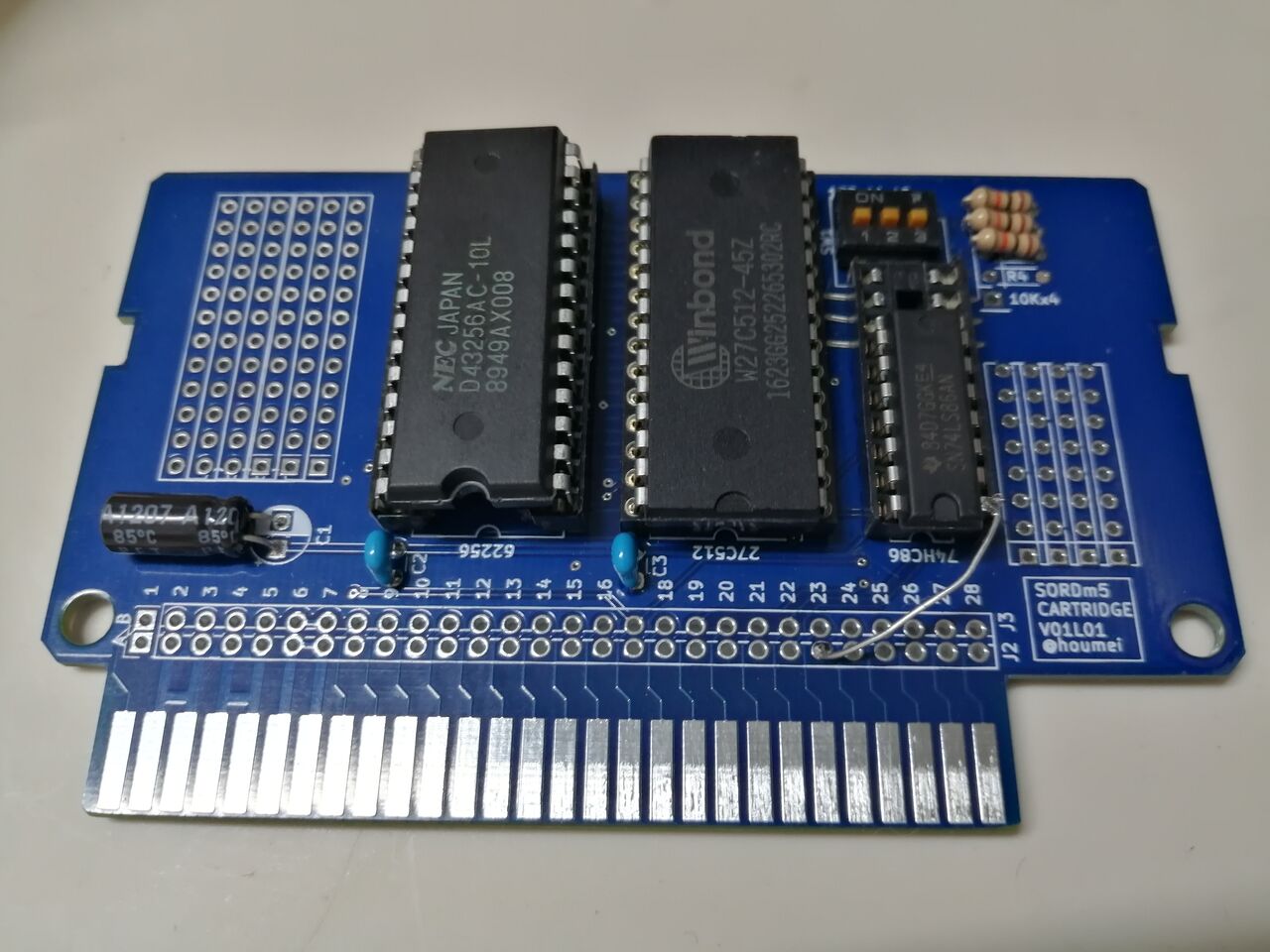 SORD m5のメモリ、0x2000~0x5FFFの16Kバイトの領域に27C512(64Kバイト)を4分割して対応させる。この指定にはA15,A14のスイッチを使う。8KバイトのゲームやBASIC-Iもあるので、16Kバイトの上位8Kバイトと下位8KバイトをA13Rスイッチで切り替える機能がある。RAMはオプションで32Kバイトを0x8000~0xFFFFに配置することができる。これによりBASIC-IやBASIC-G使用時のメモリ領域が増える。あとは調査用のカードエッジ引き出し端子やユニバーサルエリアを用意した。