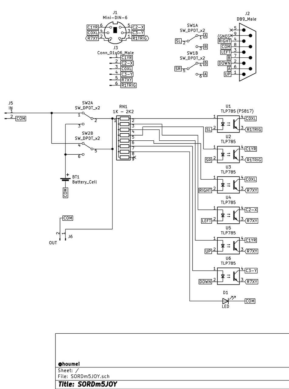 SORD m5のジョイパッド端子はmini-DIN 6ピンでL,Rの2つがある。上下左右とトリガ2つの6入力だが、これらはキーボードマトリックスの一部で2x4の構成になっている。MSXのコモン端子1つ、上下左右トリガ2つの構成はそのままでは接続できない。また、GNDも出ていない。そこでフォトカプラを使用し、MSXジョイスティックのボタンに対応する6箇所のキーをONにするような回路を考えてみた。フォトカプラのLED用に電源が別途必要になる。