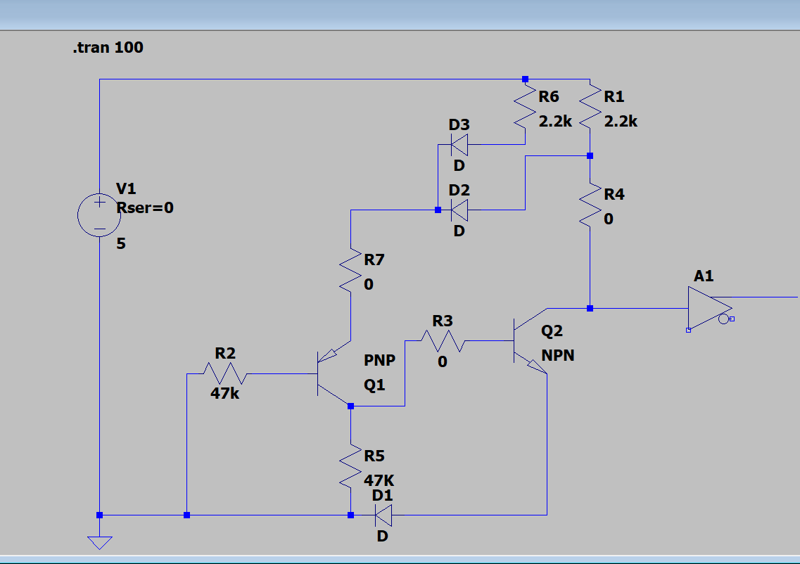 当初は無電源でMSXジョイスティックをキーマトリクスの一部に組み込めないか考えてました。フォトカプラでオンオフ→フォトカプラのLED部分がオンオフできれば動くんじゃ?ということでキースキャンの駆動部(オープンコレクタ)からGND、受け側のプルアップ2.2kΩ〜5Vで電源が取れそうということで色々LTSpiceをこねくり回していました。
